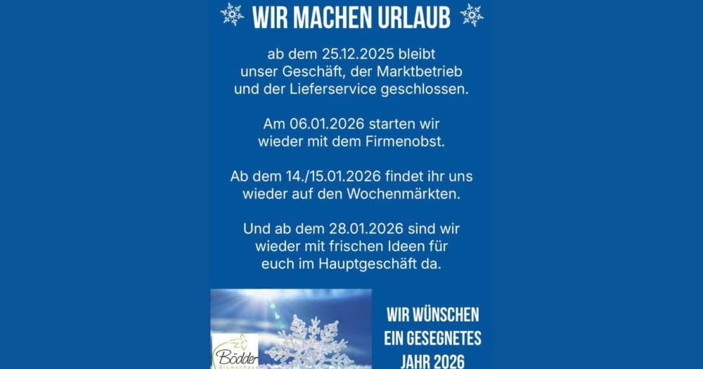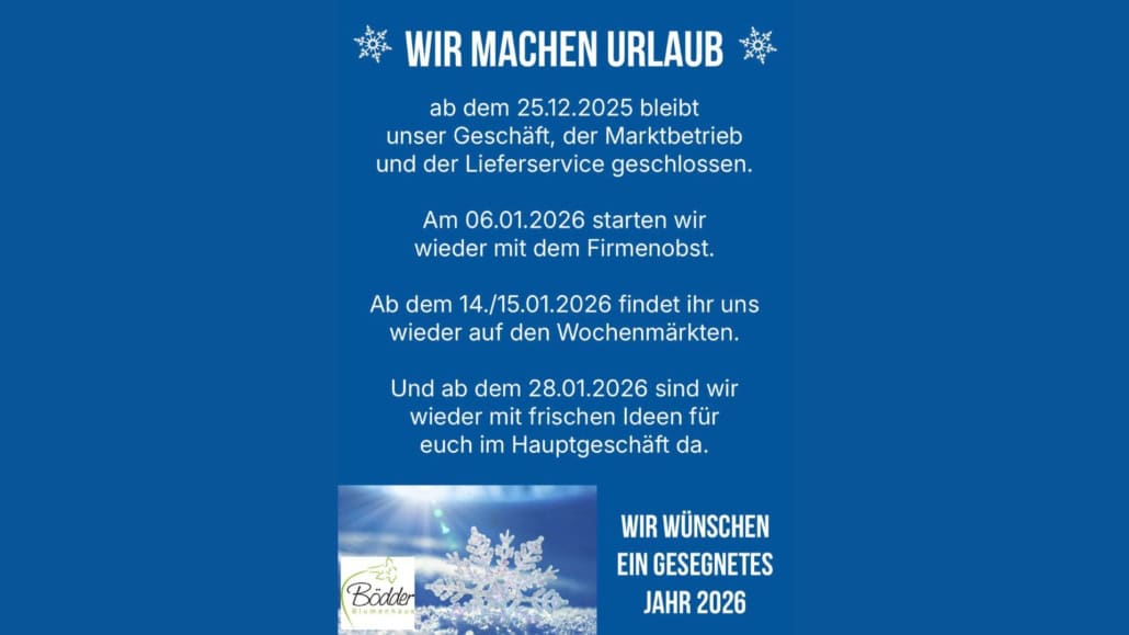 Ab dem 25.12.2025 bleibt unser Geschäft, der Marktbetrieb und der Lieferservice geschlossen. An folgenden Tagen starten wir wieder: